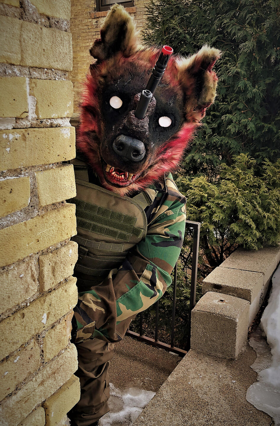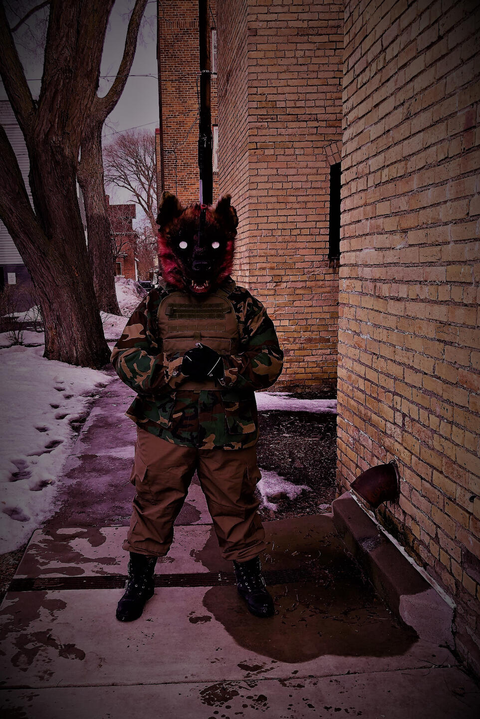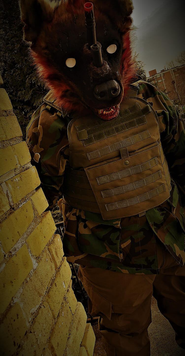 Crossfire is a fursuit that is primarily worn by its maker and owned by its maker as well. The goal of this fursuit is to not only be creepy and frightening but to be a conversation on gun violence. Fursuits are an art form in and of itself but the mission with Crossfire to use this art form to communicate something more than itself and to have a conversation about something bigger than its craft and construction.
